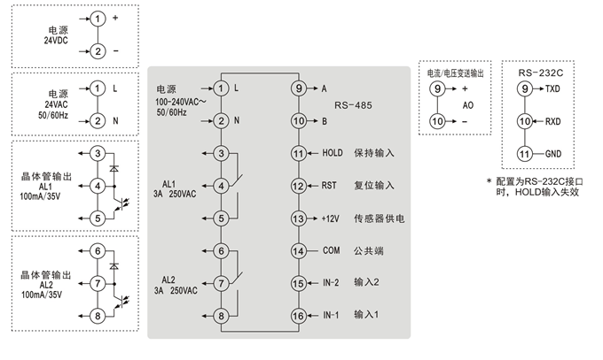 光電隔離通訊接口RS-485/RS-232C,波特率范圍2400~38400bps,Modbus RTU通訊協議 基本功能
